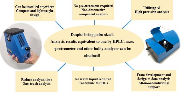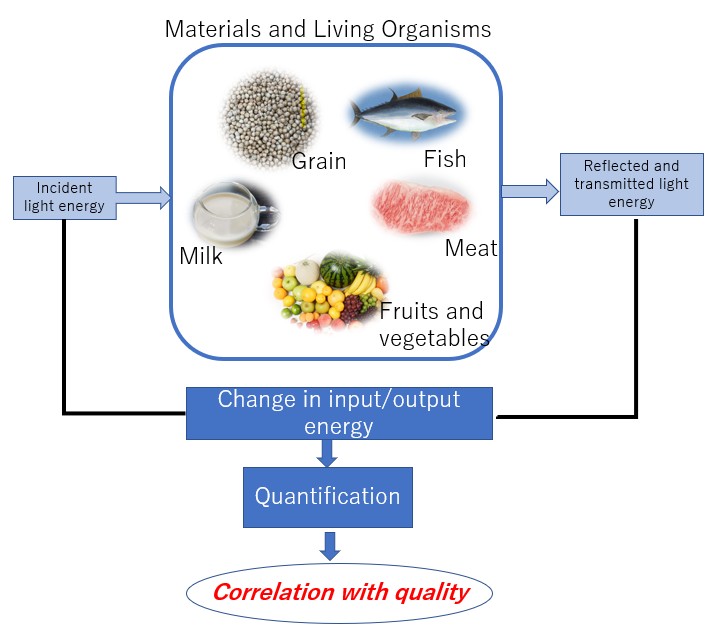 When light enters a substance or living organism, information from within the substance is transferred to the light and transmitted to us. Because it is an optical method, it is characterized by non-destructive, non-contact measurement. Our optical analyzers are divided into an analytical device section and a function that analyzes the obtained data and displays and selects the desired results. We help you accurately measure phenomena and develop and create calibration models that use that data to estimate the state of a substance of interest. The field of application is extremely broad, with great expectations for product sorting, branding, process management, and material analysis in fields such as agriculture and fisheries, food, industrial product materials, and biotechnology.